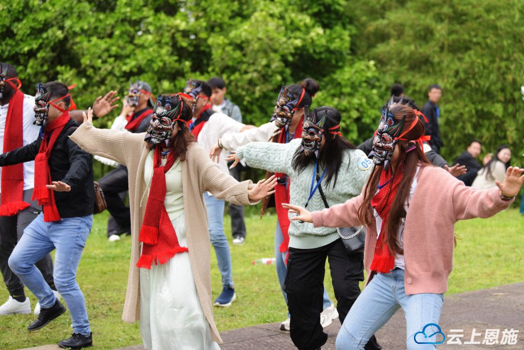 5月10日,外国游客在唐崖土司城址景区体验中国非遗傩戏舞。李维君摄