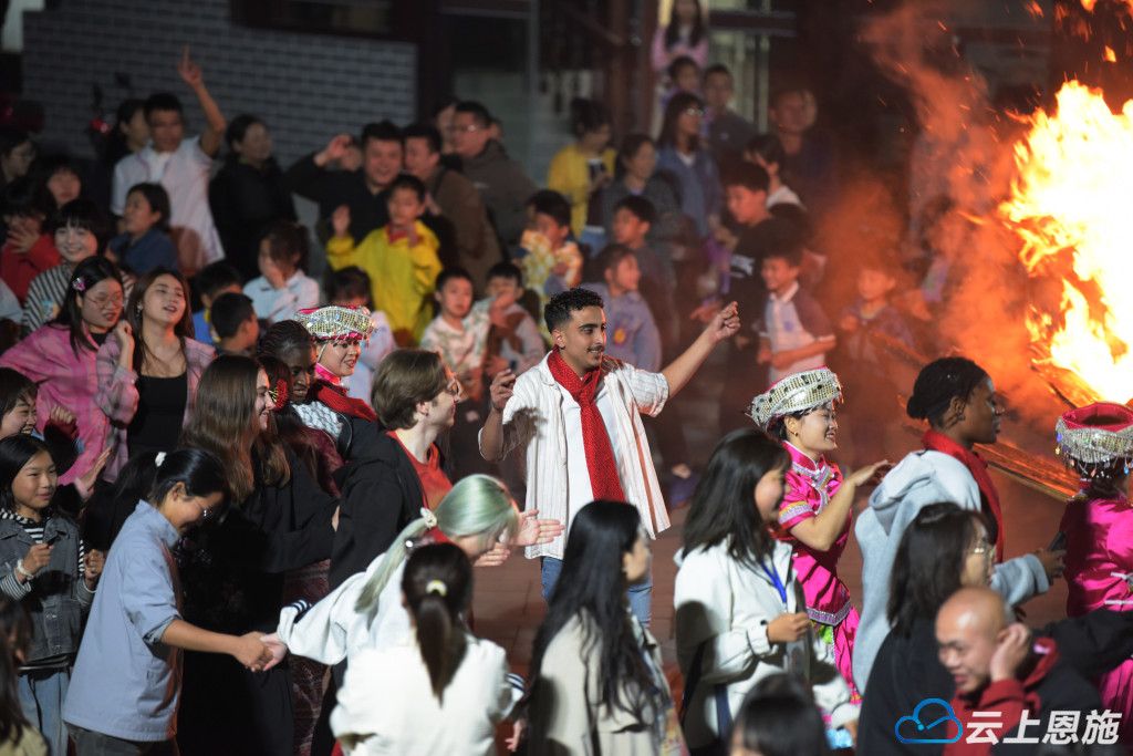 5月10日,外国游客在唐崖土司城址景区参加篝火晚会,体验土家摆手舞。李维君摄