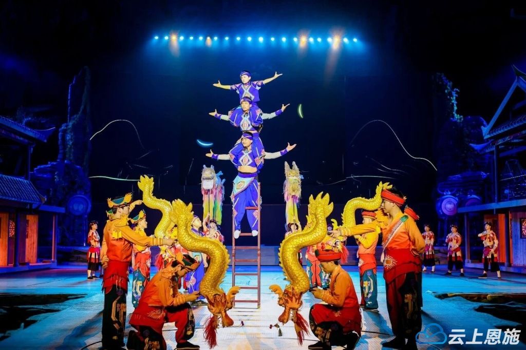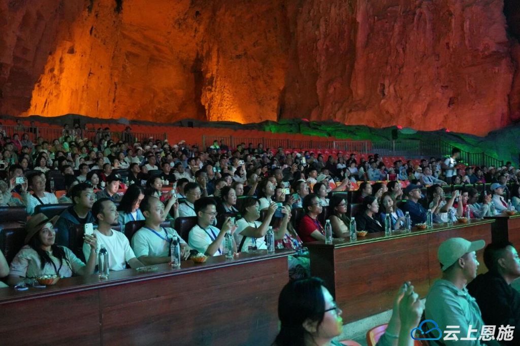 而在原生态洞穴剧场,大型原创土家族情景歌舞《夷水丽川》为旅行商们带来了一场视觉与听觉的双重盛宴。演出以土家文化为背景,从《白虎雄风》展现土家族先民的英勇无畏,到《巴裔风情》呈现独特的民族习俗,再到《龙船新韵》的悠扬旋律,生动地讲述了土家族的历史变迁和风土人情。演出中,现代科技与传统艺术完美融合,数字大屏上的绚丽画面、舞台灯光的巧妙运用、雾森营造出的梦幻氛围,以及升降舞台、移动吊脚楼、廊桥、水中龙船等道具,让旅行商们仿佛穿越时空,沉浸式体验到了土家族的独特魅力。