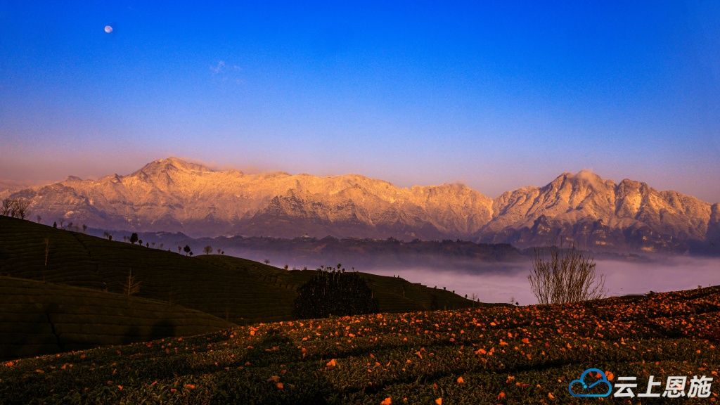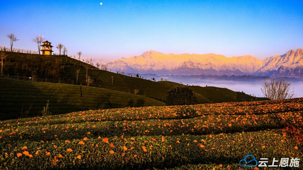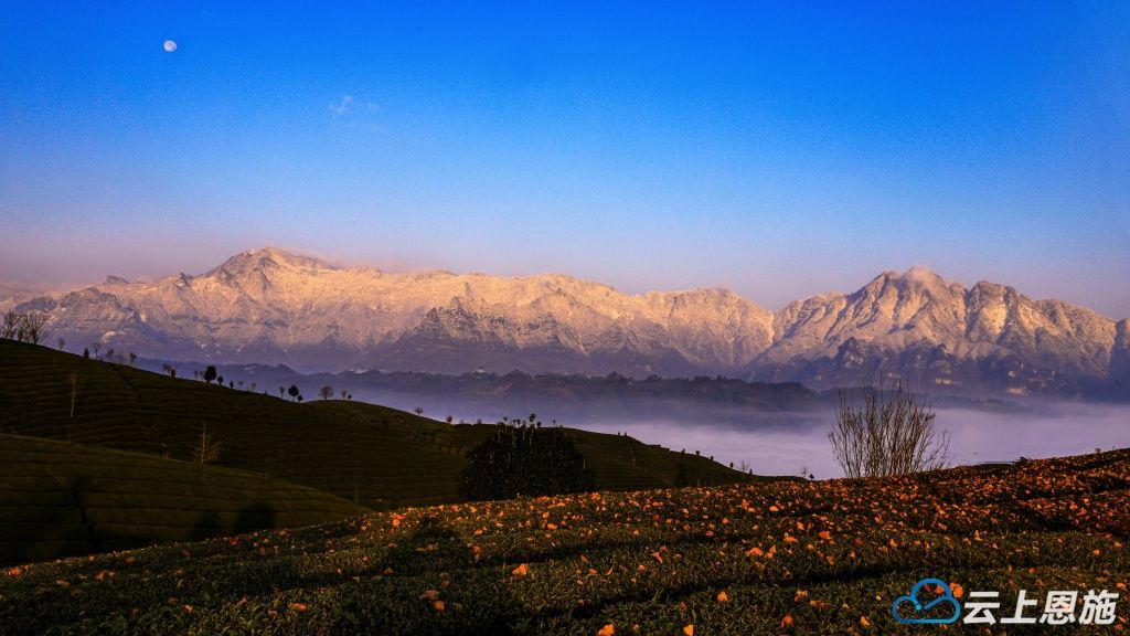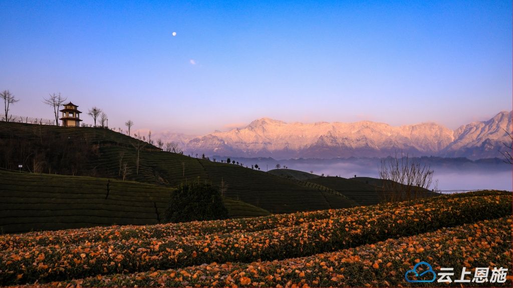 一轮晓日跃出天际,金红霞光泼洒开来,远处的雪山被染成绮丽的胭脂色。蓝天澄澈如洗,圆月与朝阳遥遥相望,清辉与金芒交融,云海腾浪,茶垄凝霜。