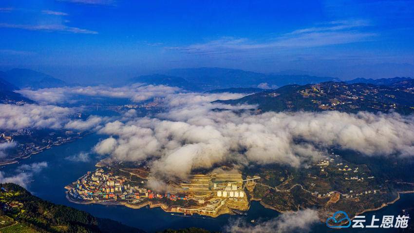 巴东县三峡移民新城,长江岸边数万亩优质晚熟柑橘,与云海交替涌现,时而露出橙黄,时而白纱拂面,一次次变换着半遮半掩的容颜。远山如黛,近岭含烟,三峡平湖中的巴东,犹如梦幻般的一幅幅丹青画卷,为天地添彩,为长江作画。