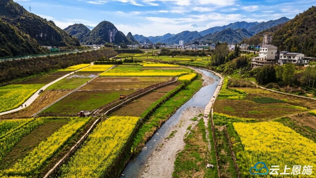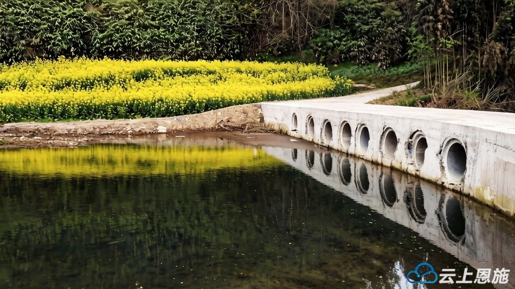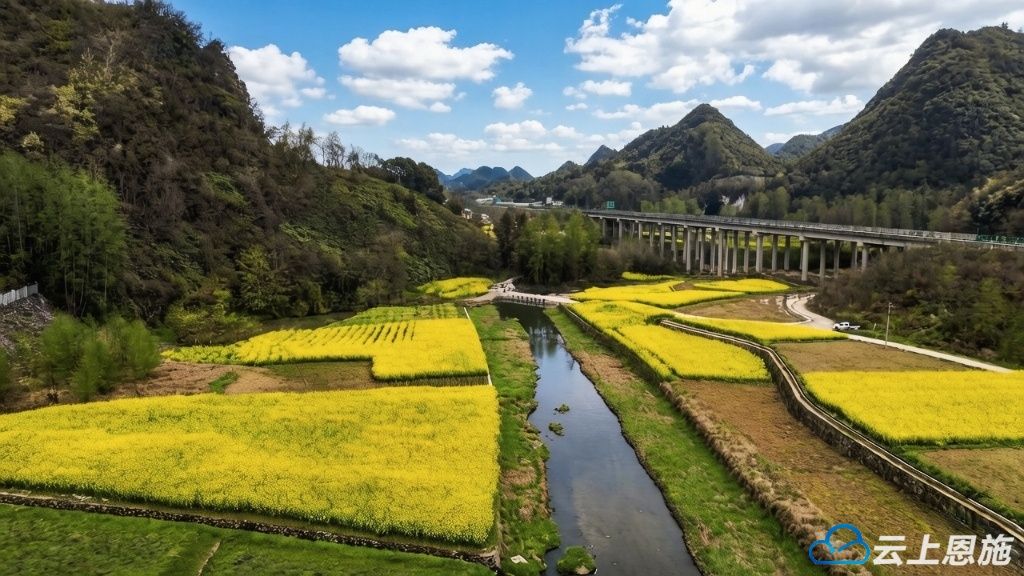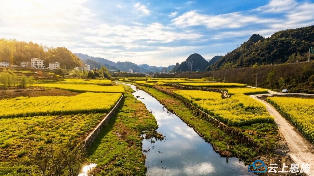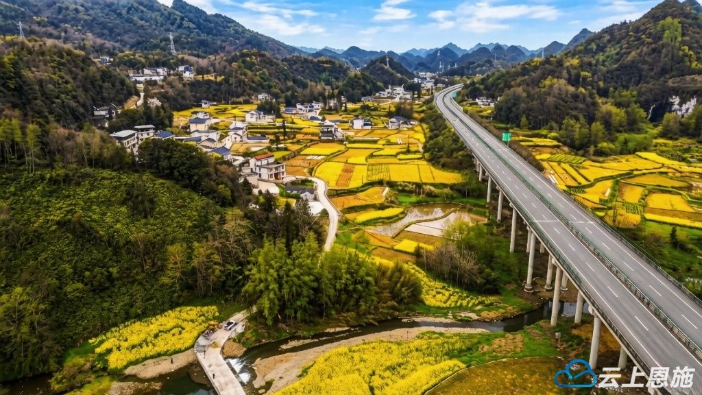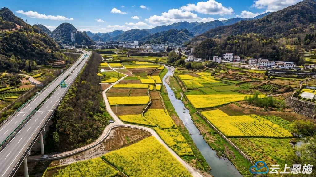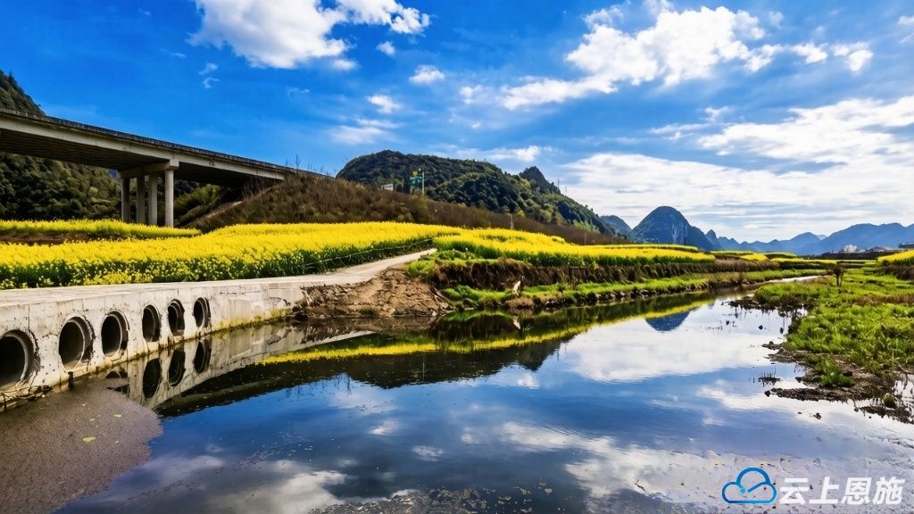 穿云的高速路旁,青山叠翠如玉,大片油菜花肆意铺展,鎏金万顷,在暖阳下泛着温柔的光,晕染出一整个春天的烂漫。澄澈水面如镜,将蓝天白云、金黄花田尽数倒映,水天相融,花影婆娑,勾勒出一幅浑然天成的山水画卷。