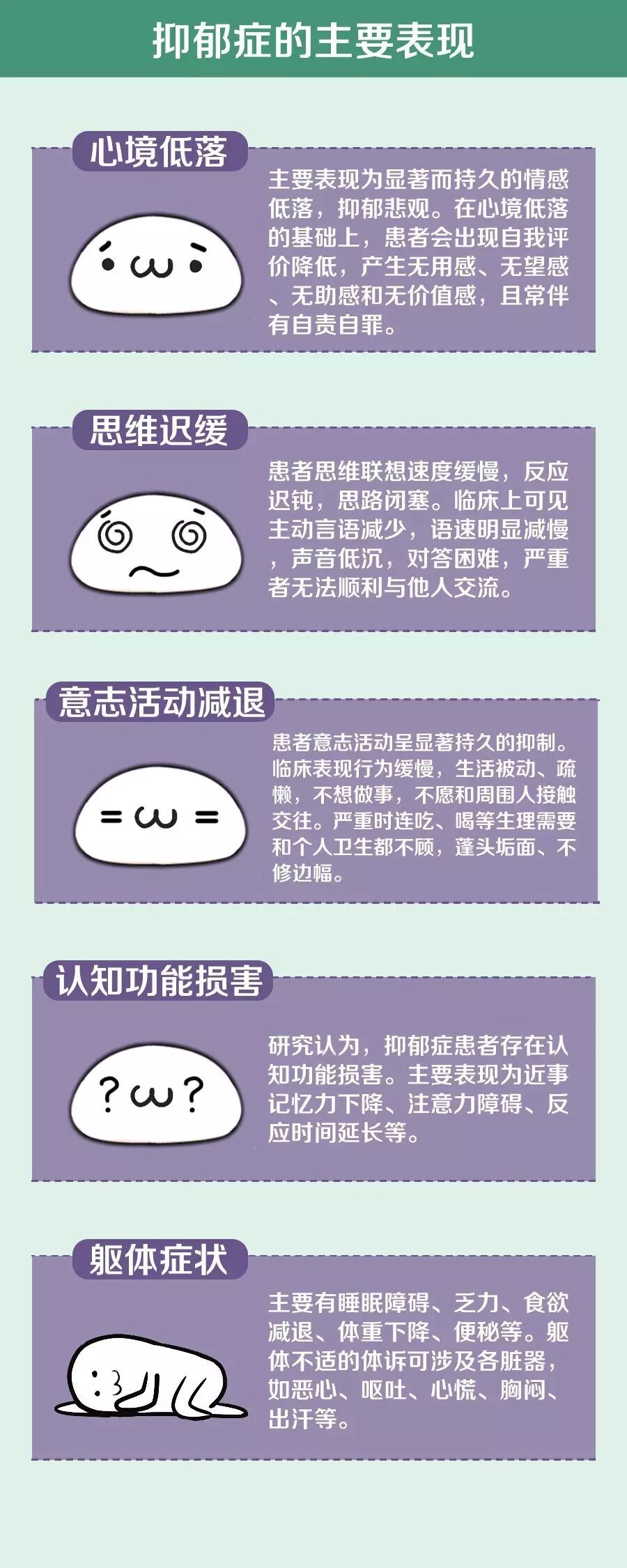 抑郁症是现代都市人的常见病,在老年人、处于更年期的妇女、青春期少年、面临激烈工作竞争和失业压力的中年人中,都很普遍,被称为精神疾病中的“普通感冒”。在医学中,抑郁症归属于“情感障碍”,有以下典型表现: