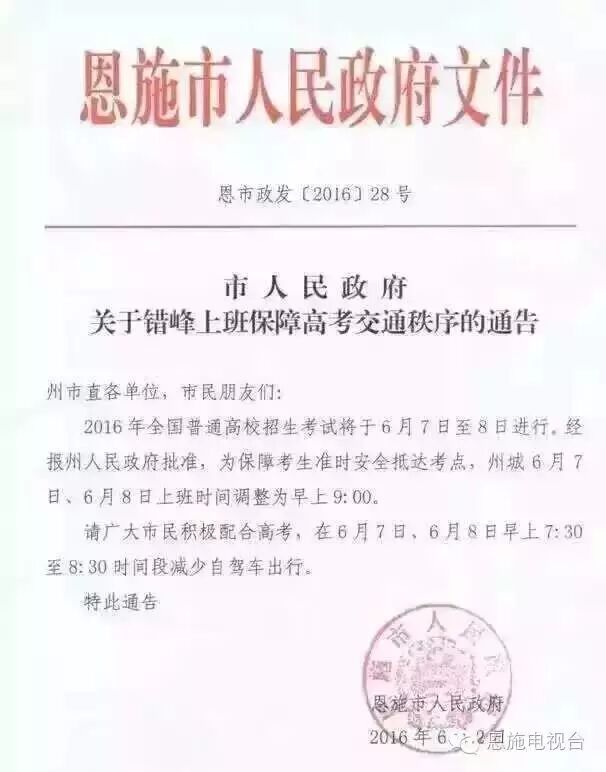 恩施市人民政府关于错峰上班保障高考交通秩序:州城6月7日、6月8日上班时间调整为早上9:00。