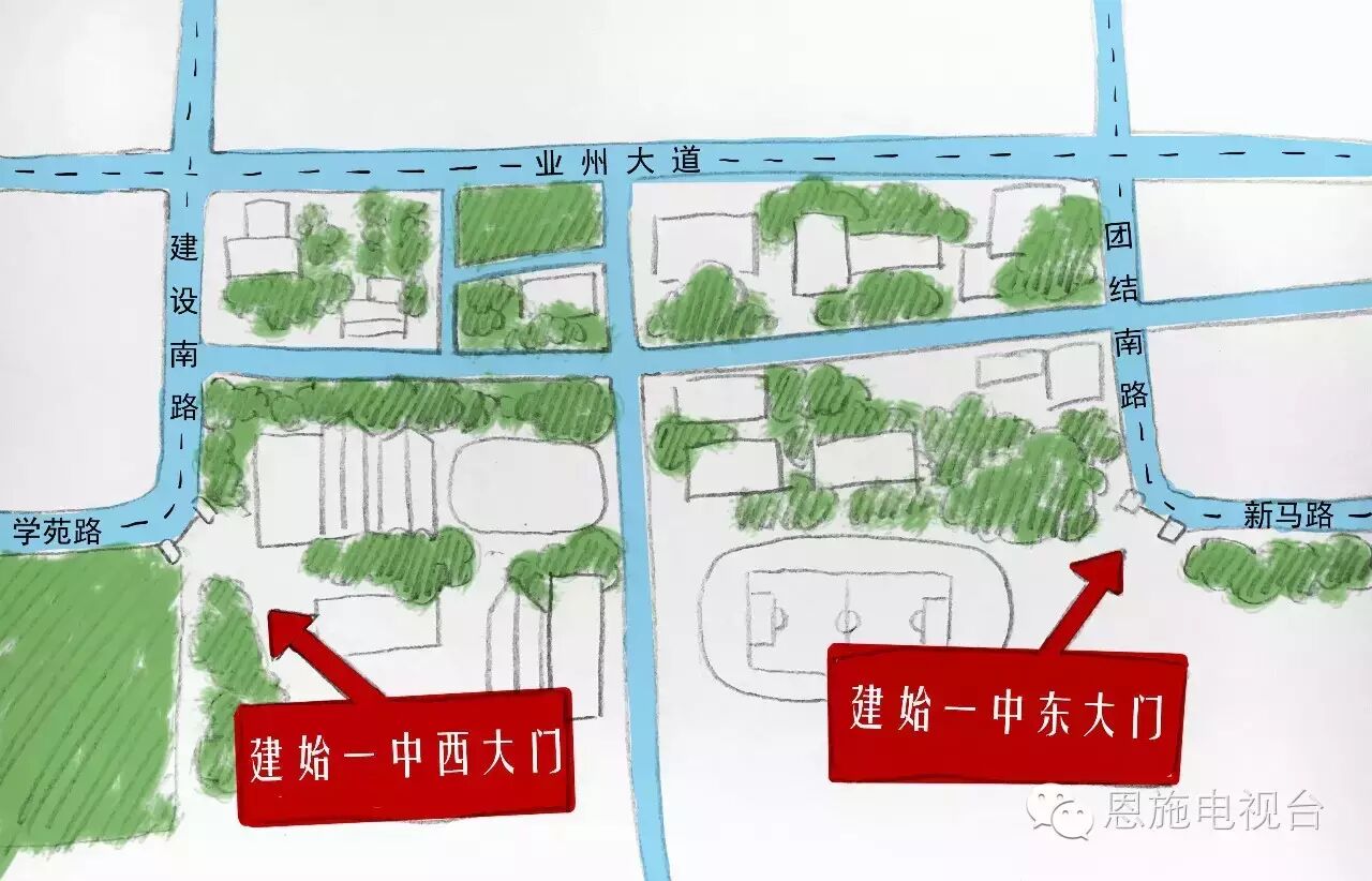 团结南路广润集贸市场出口处经建始一中东大门至新马路广润集贸市场进口路段;建设南路与学苑路交叉口经建始一中西大门至学苑路八景酒店门前路段。