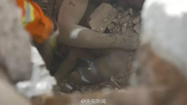 在倒塌的废墟和危房连接处,有人发现两名成人呈十字交叉形护住一名小女孩。她被爸爸妈妈手臂环抱保护着,在父母围出的空间里,她等来了救援。