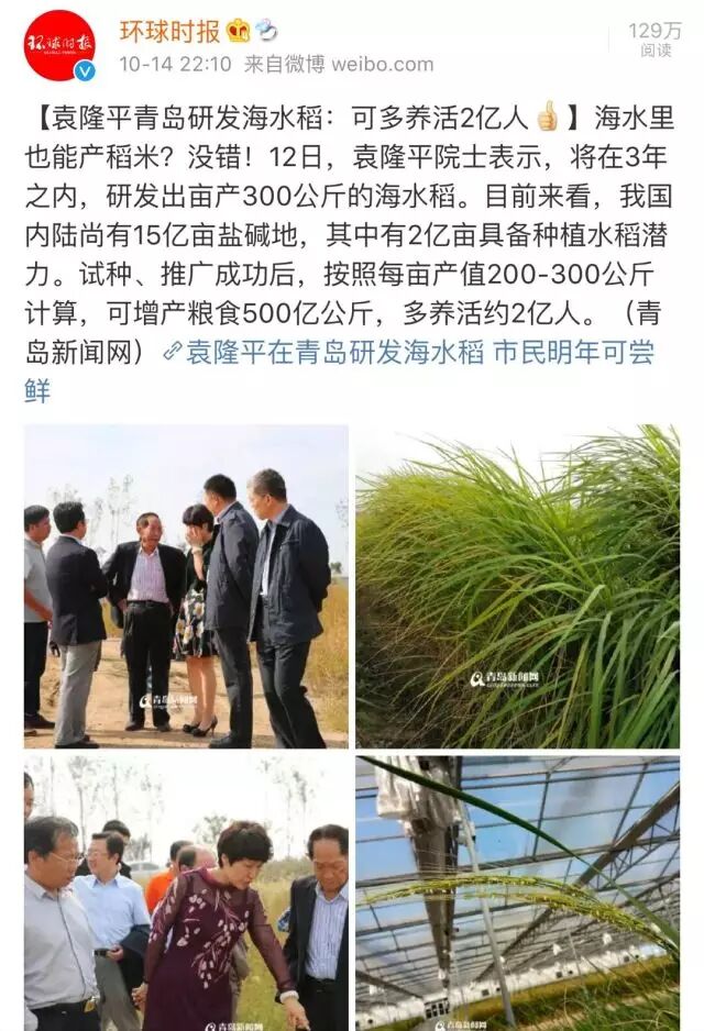 然而必须告诉大家,这条环球时报微博也一度跟风转发了的信息并不准确,只说对了一半。因为这海水稻的研究工作,还离不开另外一个我们很多人并不怎么熟悉的广东农业科学家的名字。