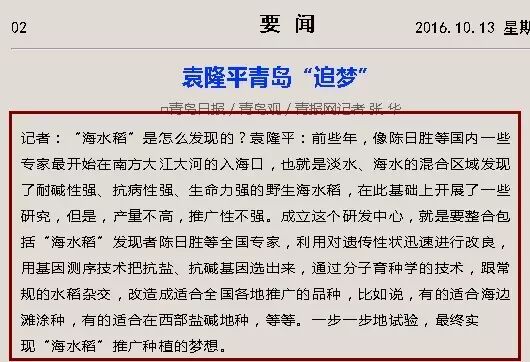 实际上,袁隆平这两天在青岛举行的关于海水稻研发的发布会上就曾多次提到了陈日胜先生。袁老先生还很坦率地表示,其实他来青岛成立这个海水稻研发中心,正是为了把陈日胜这位海水稻的发现者以及国内其他一些同样在研究海水稻的专家的智慧“整合”在一起,通过杂交水稻技术最终培养出不仅可以用海水灌溉,更可以用于商业推广的高产水稻。