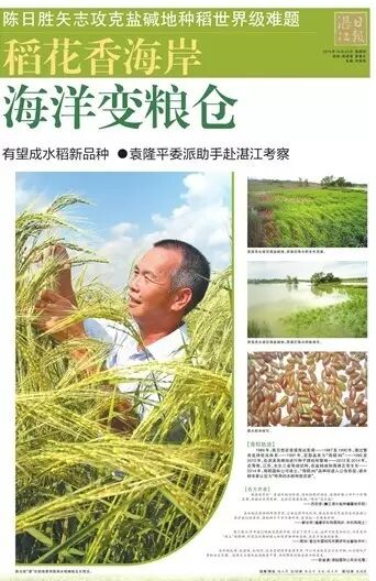 实际上,从广东多家媒体过往的报道来看,这海水稻的发现和培育,还要多亏陈日胜先生呢。因为,是他早在1986年的时候,最先发现了一种可以抵抗海水盐碱性的野生水稻,并从此开始了近30年的海水稻培育工作。