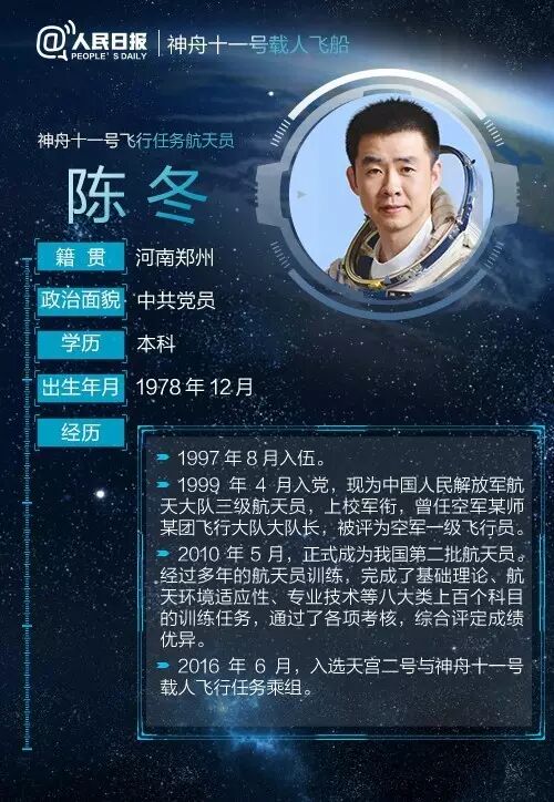 陈冬,1978年12月出生,1997年8月入伍。2010年5月,陈冬正式成为我国第二批航天员。10月17日,他将和景海鹏一起驾驶神舟十一号飞船飞赴太空,他也是第二批5名男航天员中首位实现飞天梦的人。