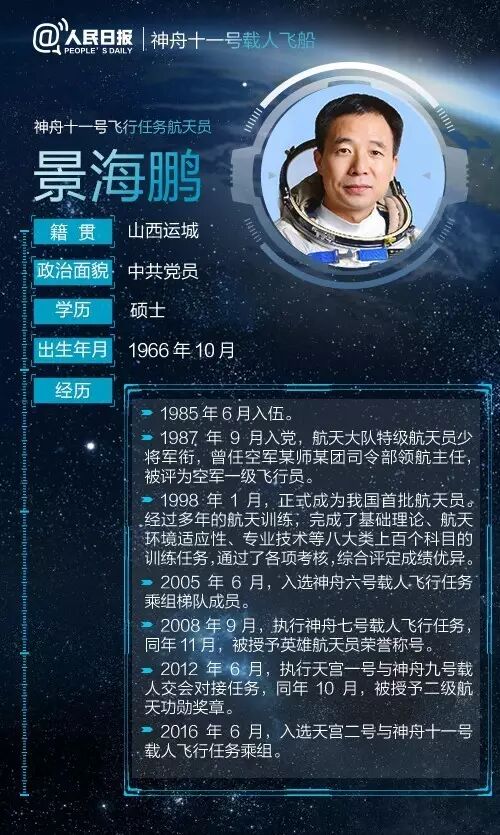 已执行过神舟七号、九号两次飞行任务的景海鹏第三次“出征”,担任神舟十一号的指令长,这在中国航天员中尚属首次,景海鹏以50岁“高龄”上天也创造了中国航天员的纪录。