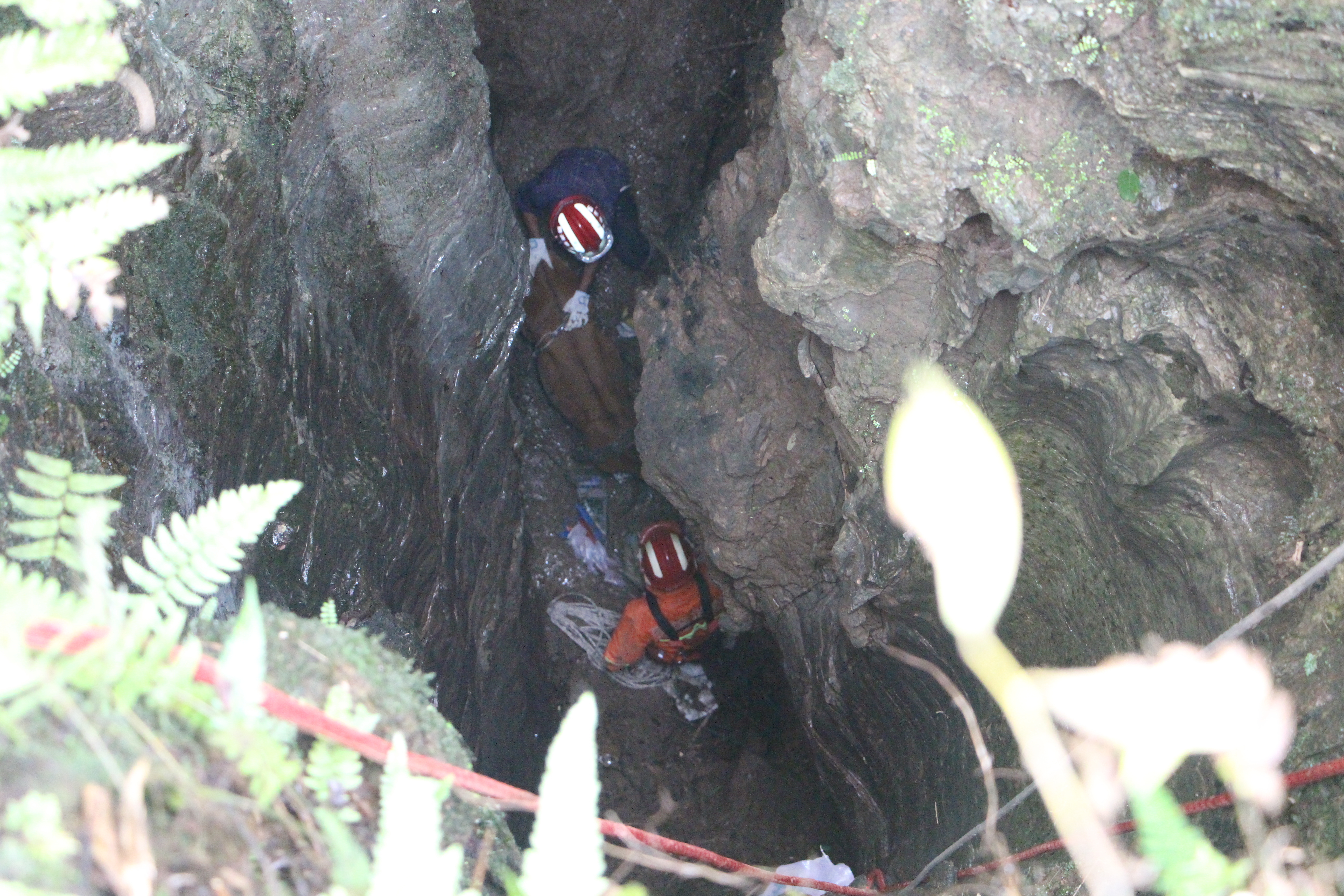 10时15分许,消防官兵迅速在天坑上方展开救援。首先,寻找两个较结实的树木作为救援绳一头的固定点,再由一名做好安全防护的消防官兵携带救援装备沿天坑一侧下至坑底,随后利用救援绳在牛身上制造3个受力点,将其中一个受力点固定动滑轮后,将三个受力点的绳头送至天坑上方。耕牛由于受到惊吓,拼命挣扎,消防官兵3进天坑才将耕牛身上的绳子系牢,三方用力,人与地心引力的500斤拉力赛才刚刚开始。
