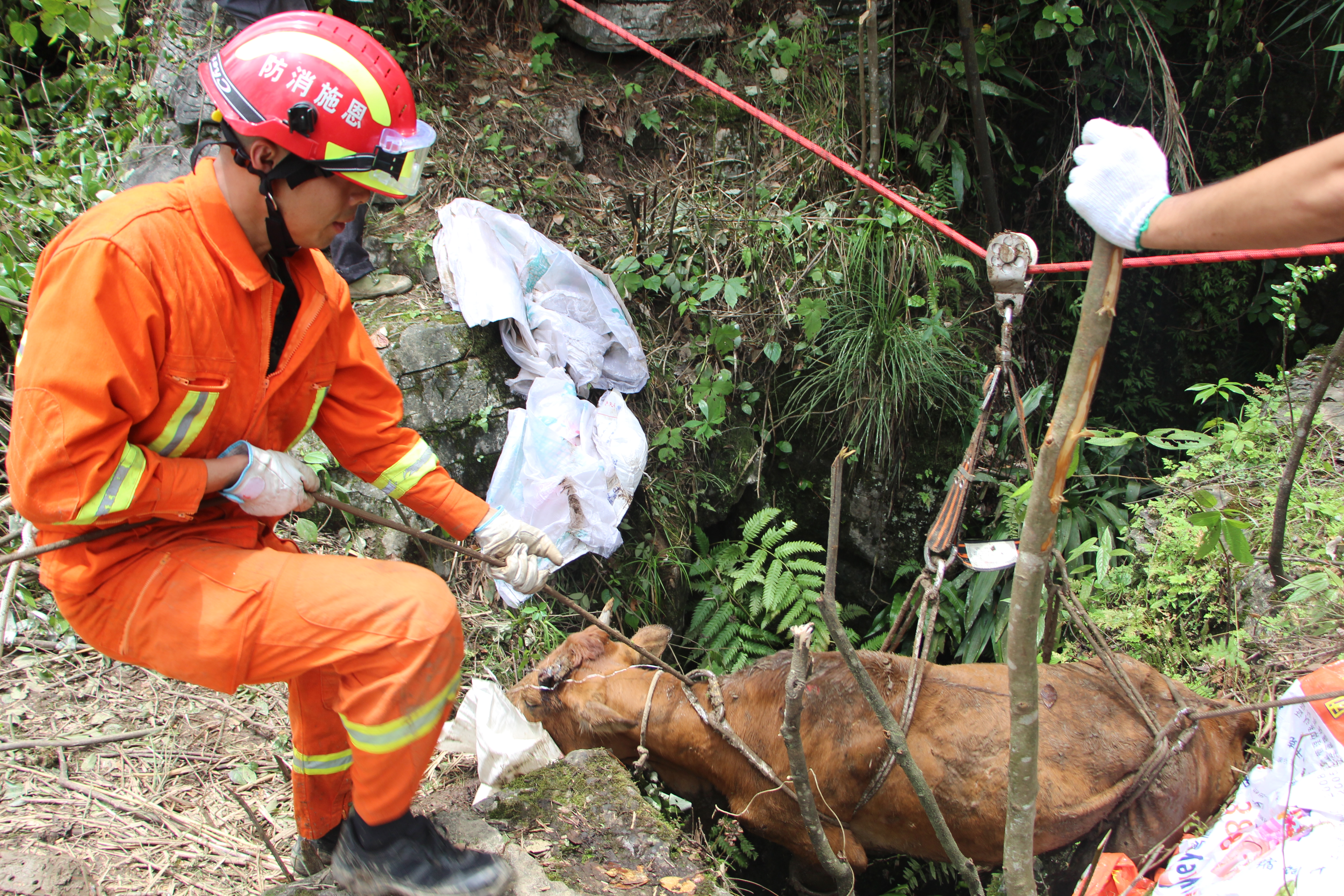 7月5日8时13分,恩施市三岔乡三元坝村某住户靠以养家糊口的耕牛失足掉进30米深的天坑。接到报警后,清江消防中队立即赶赴现场,利用周围树木、救援绳、滑轮等工具,成功将耕牛救出。令人惊讶的是,这只耕牛从30余米的落差摔下后并无大碍,被其主人笑称”钢铁牛”。